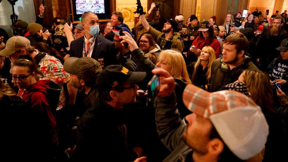 Holding American flags and handmade signs, the demonstrators in Lansing first congregated shoulder-to-shoulder outside before demanding to be let inside the building. Some chanted "Let us in," The Detroit News reported.