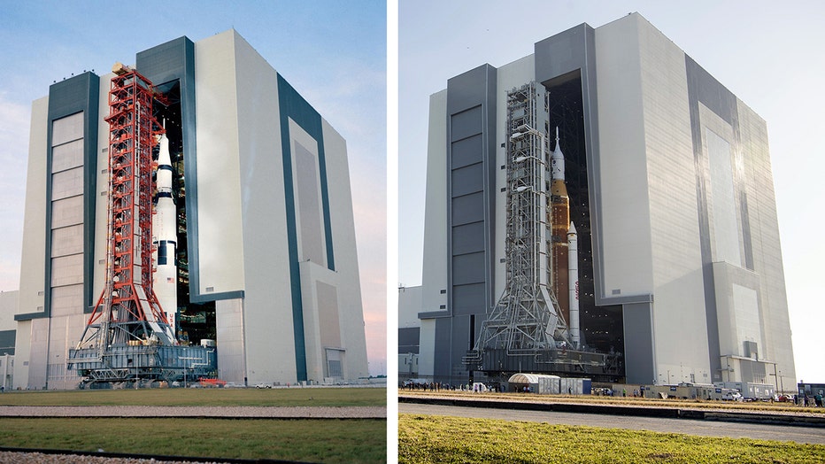 On the left, the Saturn V rocket for the Apollo 14 mission rolls out to the pad in 1970. On the right, the crawler-transporter is seen carrying the Artemis I rocket in 2022. (NASA / Aubrey Gemignani)