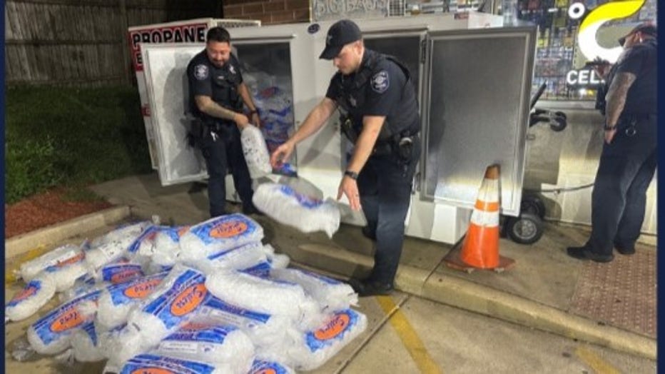 With the station clerk’s permission, officers had to move more than 1,000 pounds of ice to help free the trapped kitten.