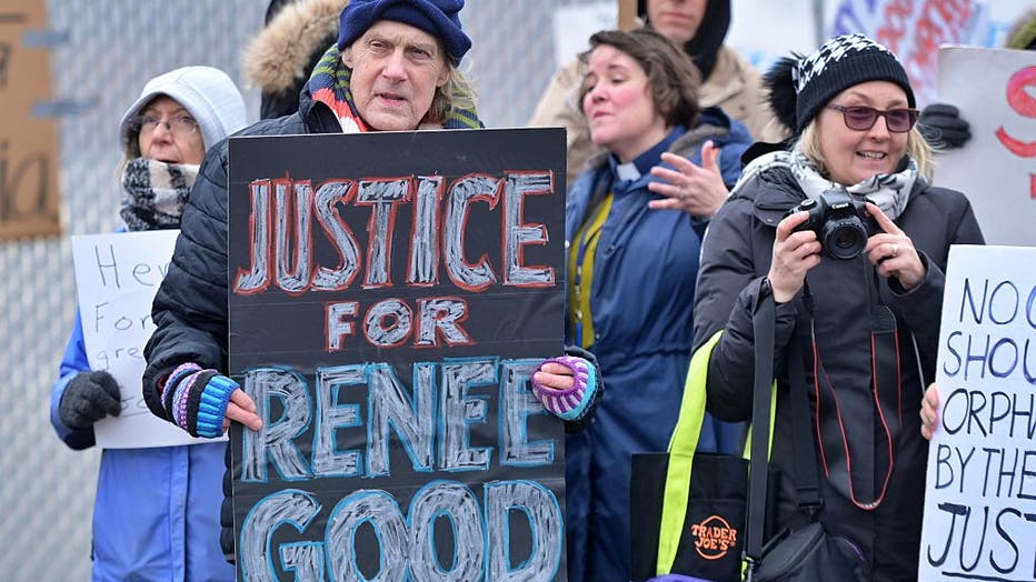 BROADVIEW, ILLINOIS - JANUARY 09: An activist holds a sign reading 'Justice for Renee Good' during a protest outside a U.S. Immigration and Customs Enforcement (ICE) processing center on January 9, 2026, in Broadview, Illinois. Demonstrators gathered