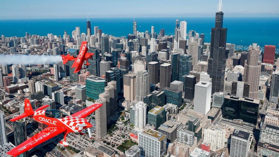 Team Oracle, Hall of Fame Air Show Performer Sean D. Tucker (top) and Jessy Panzer (bottom) fly their aircrafts over Chicago as they prepare for the 61th annual Chicago Air and Water Show on August 15, 2019 in Chicago, Illinois. (Photo by KAMIL KRZAC