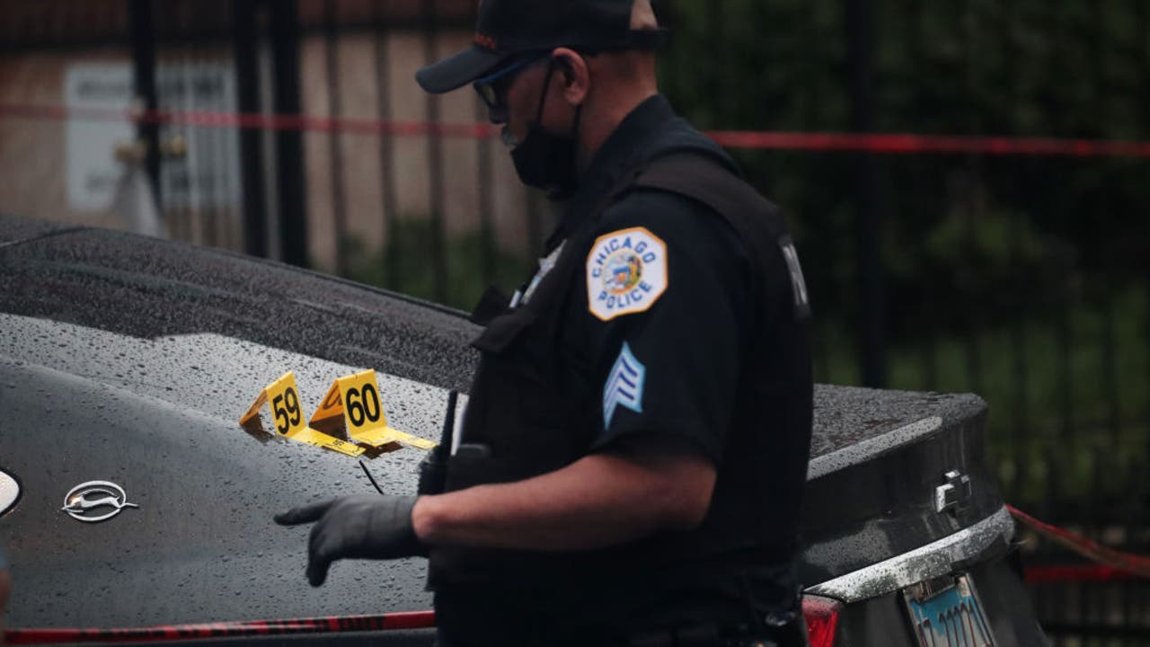Shell casings labeled 59 and 60 rest on a bullet-riddled car as police investigate the scene of a shooting in the Auburn Gresham neighborhood on July 21, 2020 in Chicago. (Photo by Scott Olson/Getty Images)