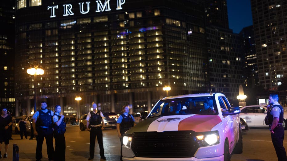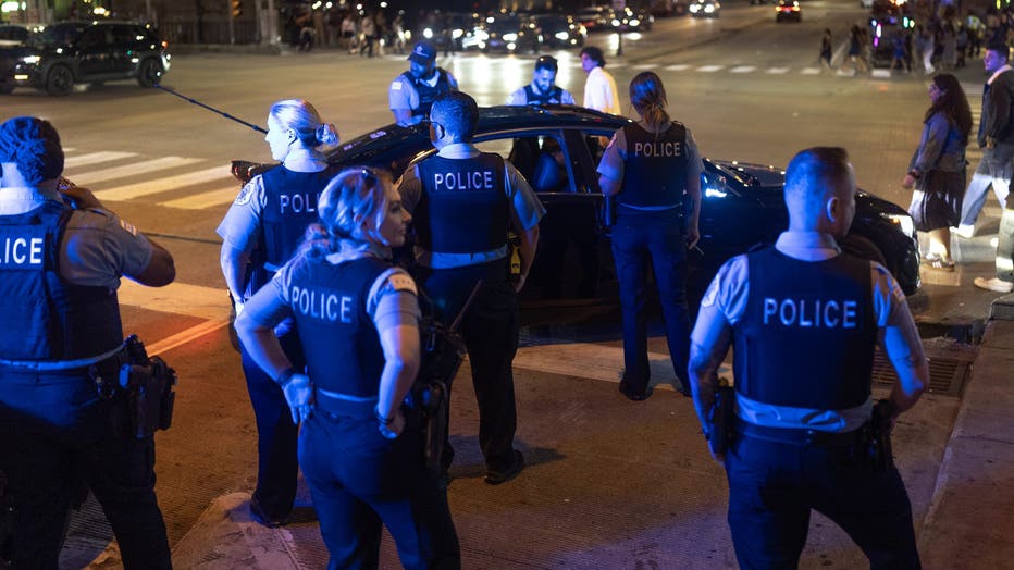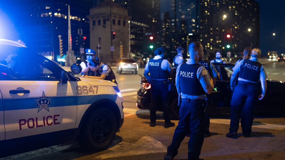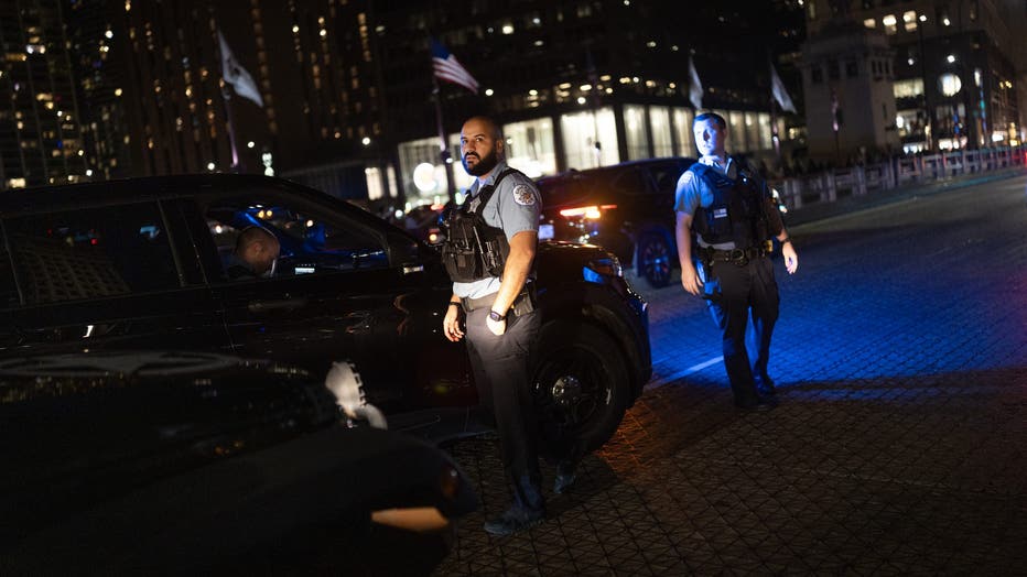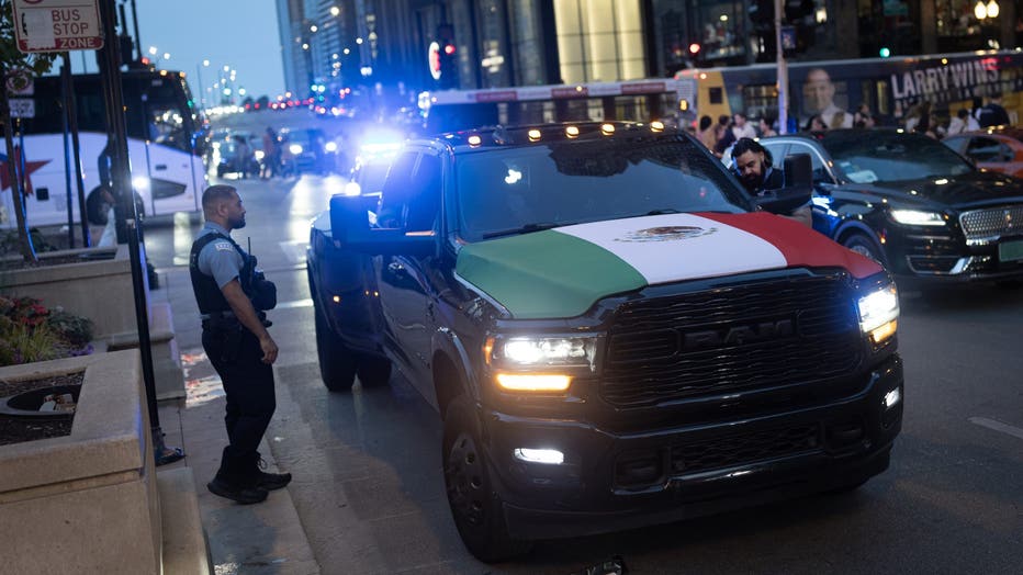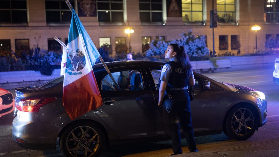 CHICAGO, ILLINOIS - SEPTEMBER 13: Police pull over a driver for displaying a Mexican flag on his vehicle as he celebrates Mexican Independence Day in the Loop on September 13, 2025 in Chicago, Illinois. Police were writing citations to drivers for di