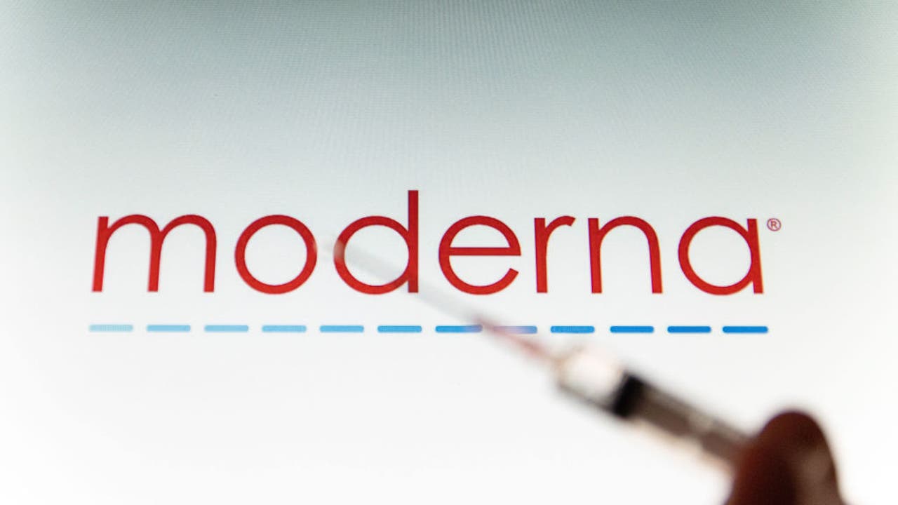 The Moderna pharmaceutical corporation logo is pictured in a file image. (Photo by Nicolas Economou/NurPhoto via Getty Images)