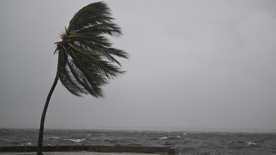 A coconut tree sways in the wind at the Kingston Waterfront on Ocean Boulevard in Kingston, Jamaica, as Jamaica starts to feel the effects of Hurricane Mellisa on October 26, 2025. Hurricane Melissa was cutting a deadly path in the Caribbean on the n