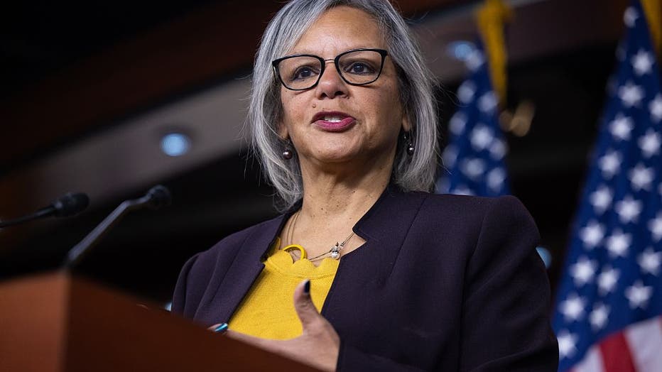 WASHINGTON, DC - JANUARY 14: Congresswoman Robin Kelly (D-IL) speaks at a press conference with other House Democrats on articles of impeachment against Homeland Security Secretary Kristi Noem, in Washington, DC on January 14, 2026. (Photo by Nathan