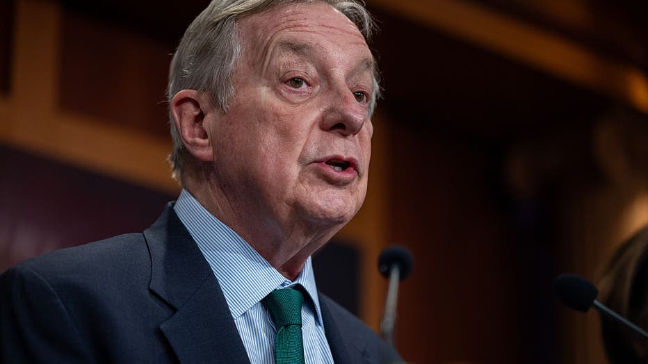 WASHINGTON, DC - FEBRUARY 24: Senator Dick Durbin (D-IL) speaks at a press conference with other Senate Democrats ahead of President Trumpâs State of the Union address, at the U.S. Capitol in Washington, DC on February 24, 2026. (Photo by Nathan Posn