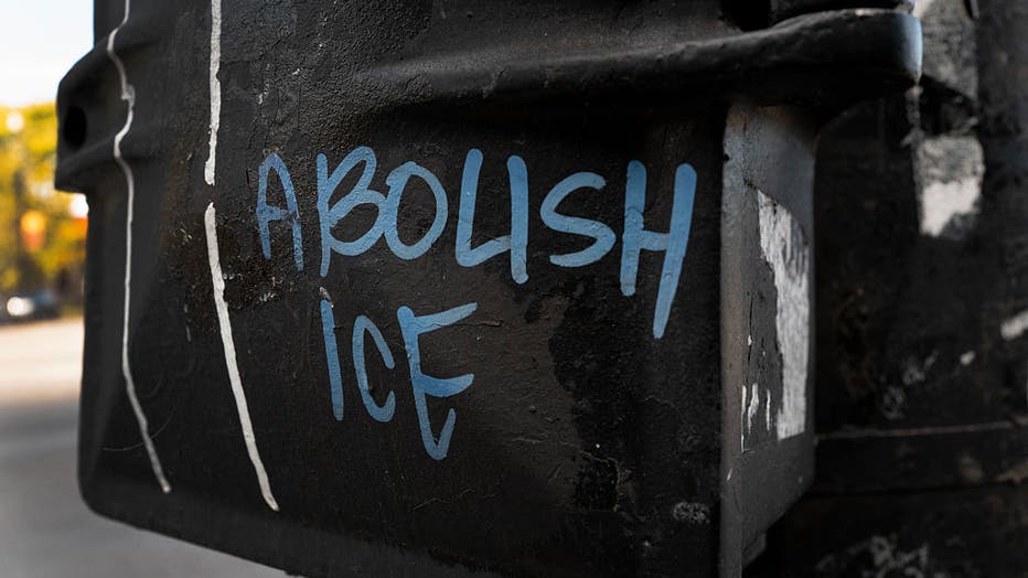 CHICAGO, ILLINOIS - NOVEMBER 01: Graffiti on a utility pole expresses dissatisfaction with President Donald Trump's immigration policies on November 01, 2025 in Chicago, Illinois. The Trump administration's Operation Midway Blitz, an organized effort