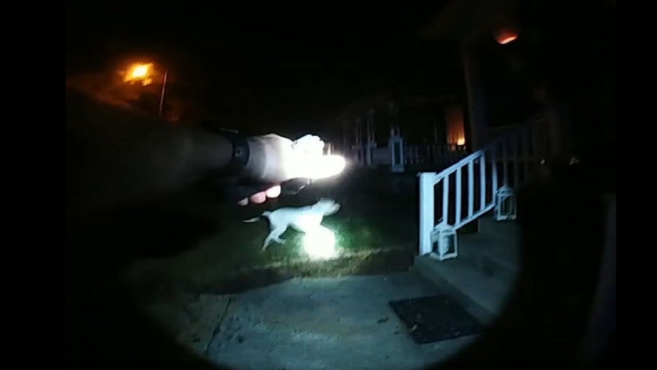 The officer is seen in another part of the bodycam footage gesturing for a white dog to back away from him. (Terre Haute Police Department)