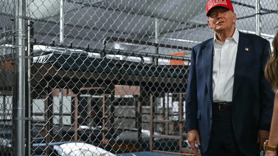 US President Donald Trump tours a migrant detention center, dubbed "Alligator Alcatraz," located at the site of the Dade-Collier Training and Transition Airport in Ochopee, Florida on July 1, 2025. (AFP via Getty)