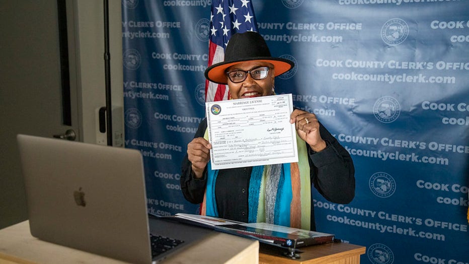 The marriage ceremony, conducted over Zoom, was officiated by Cook County Clerk Karen A. Yarbrough.