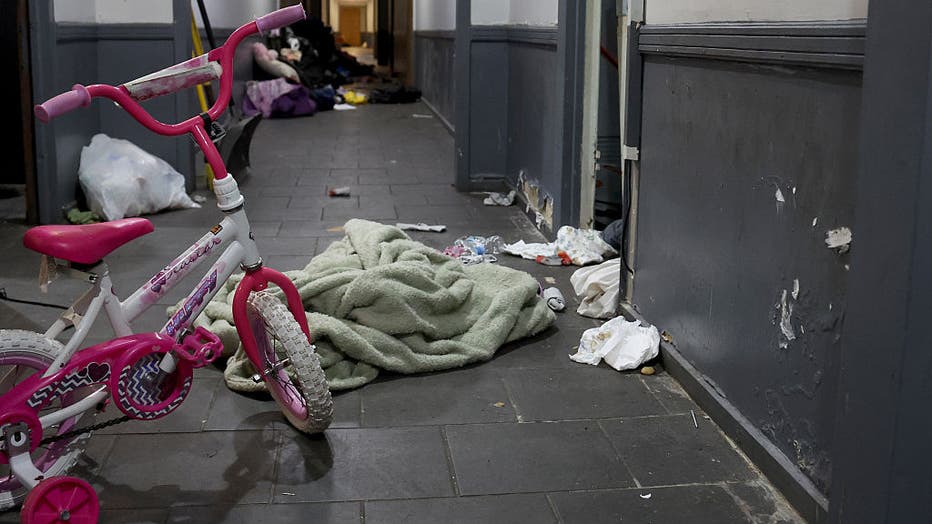 A pink bicycle, diapers and clothing are scattered about the second floor hallway following a raid by U.S. Immigration and Customs Enforcement agents the previous week at 7500 S. South Shore Drive in Chicago, Monday, Oct. 6, 2025. (Antonio Perez/Chic