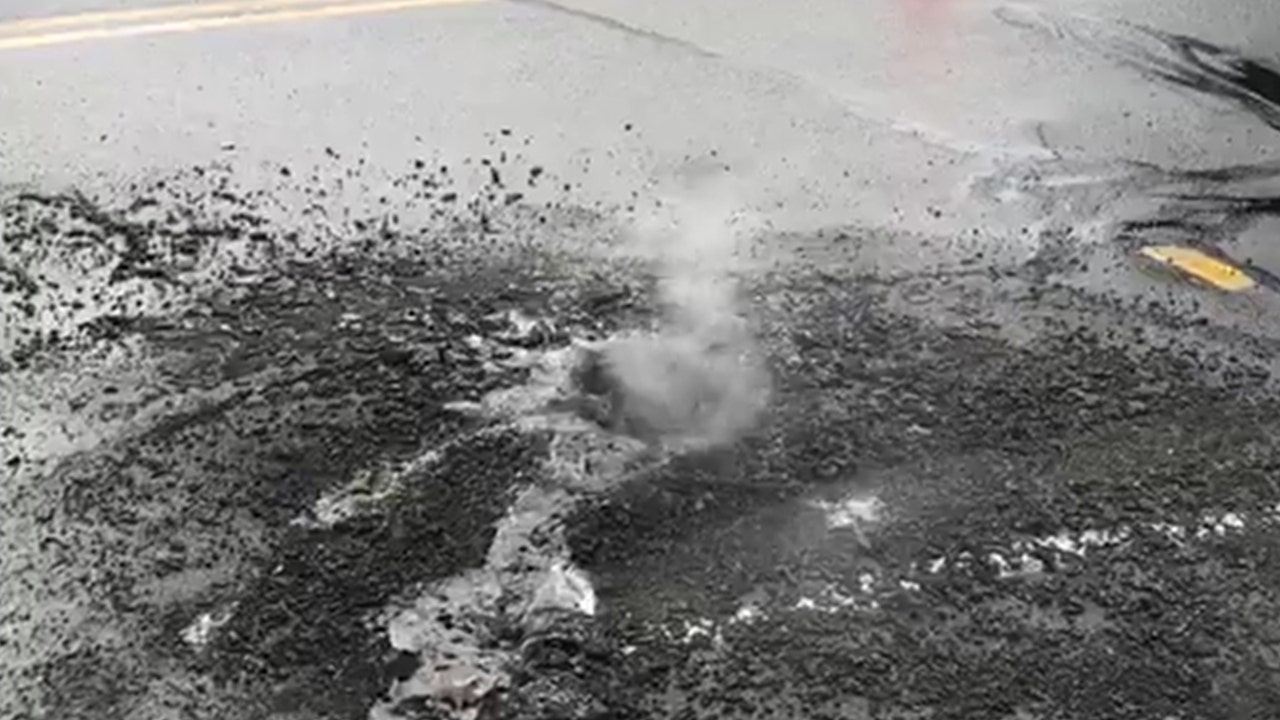 The lightning bolt hit a street Tuesday in Hatfield, located about 100 miles west of Boston. The strike left a 6-inch deep, 10-inch wide hole that had smoke billowing from it, surrounded by pieces of asphalt.