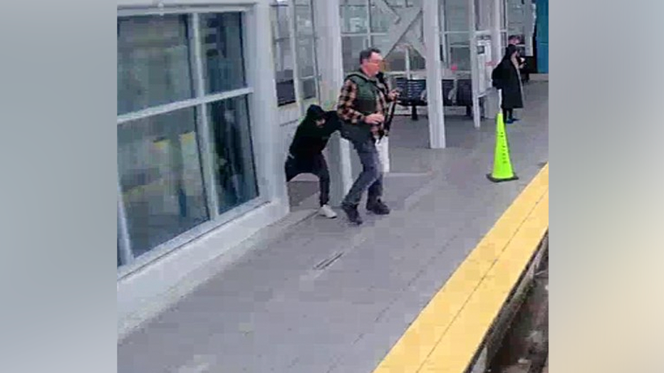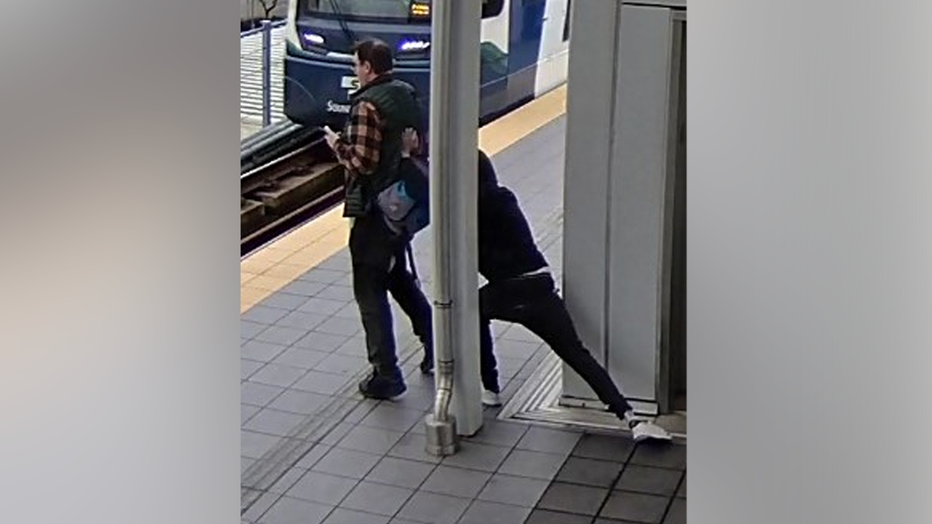 Surveillance video shows a suspect approaching a man from behind and attempting to shove him toward the tracks at Seattle’s Northgate light rail station. (King County Sheriff's Office)