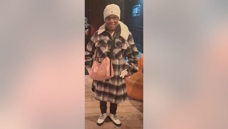 She was last seen wearing a knitted white hat, a black plaid oversized coat, white and blue Nike dunks, black jeans and red glasses.