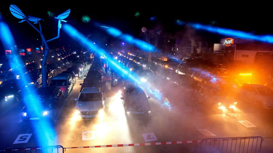 Guests park their cars during a car disco in the parking lot of the disco "Index". This large capacity discotheque in Grafschaft Bentheim is offering a car disco for the second time. In 250 cars a total of 500 guests can participate. (Hauke-Christian Dittrich/picture alliance via Getty Images)