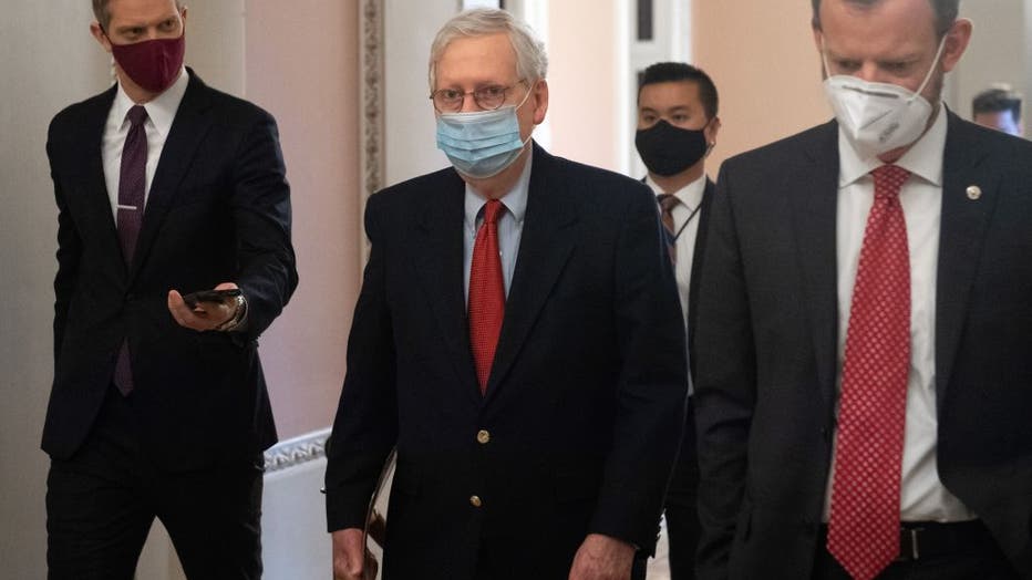 US Senate Majority Leader Mitch McConnell, Republican of Kentucky, walks to the Senate Floor at the US Capitol in Washington, DC on December 18, 2020.