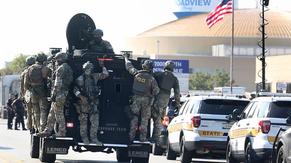 Federal agents on board an armor vehicle ride toward protesters as dozens of protesters clash with federal agents and Illinois State Police troopers near the U.S. Immigration and Customs Enforcement holding facility in Broadview on Oct. 3, 2025. (Ant