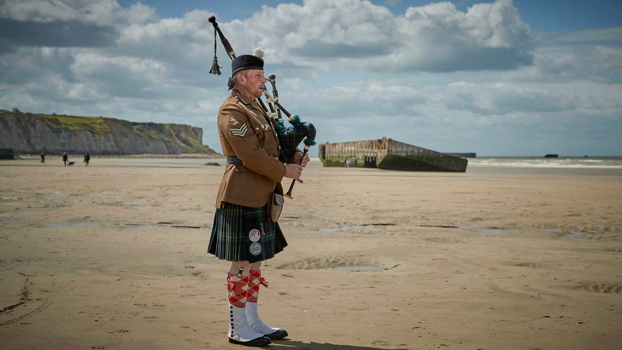 ARROMANCHES-LES-BAINS, FRANCE - JUNE 06: Jerome Levannier, a lone piper, plays Amazing Grace as he walks on Gold Beach in Arromanches to commemorate the 76th Anniversary of the D-Day landings. Due to Covid-19 travel restrictions this is the first tim