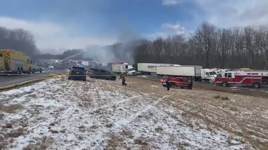 Several vehicles, including tractor trailers, were involved in a crash on I-81 in Pennsylvania after a snow squall caused low visibility.  (FOX 56 WOLF)