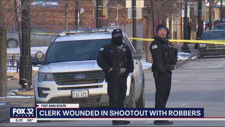 Four males entered the store about 1:45 p.m. in the first block of East 71st Street and took cash from the register by force, Chicago police said. As the clerk took out his own gun and fired shots, the suspects returned fire and struck the clerk in the chest.