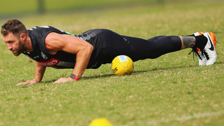 Travis Cloke performs push-ups during a Collingwood Magpies AFL training session on April 12, 2016 in Melbourne, Australia. (Photo by Michael Dodge/Getty Images)