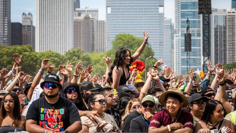 Sueños Festival goers enjoy the sun and music against the Chicago skyline while at Grant Park on May 28, 2023 in Chicago, Illinois. (Photo by Natasha Moustache/Getty Images)