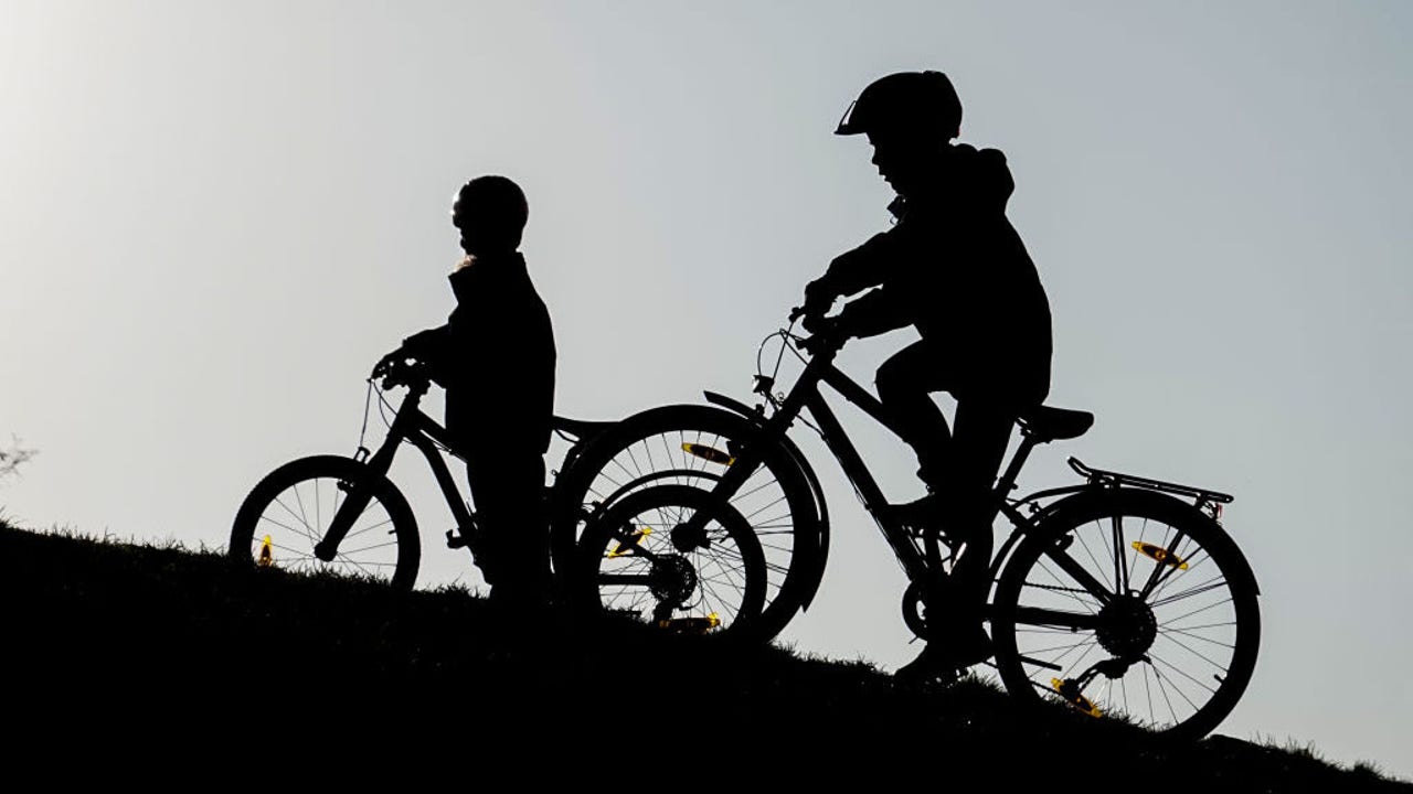 Two children ride their bikes up a hill. (Photo by Jan Woitas/picture alliance via Getty Images)