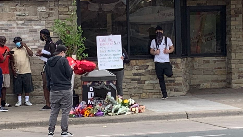 People begin to gather for a protest at the site of Floyd's death at 38th Street and Chicago Avenue South.