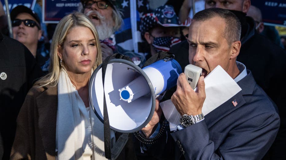 Former campaign adviser to U.S. President Donald Trump, Corey Lewandowski (R) and former Florida Attorney General Pam Bondi speak to the media about a court order giving the Trump campaign access to observe vote counting operations on November 5, 202 (Photo by Chris McGrath/Getty Images)