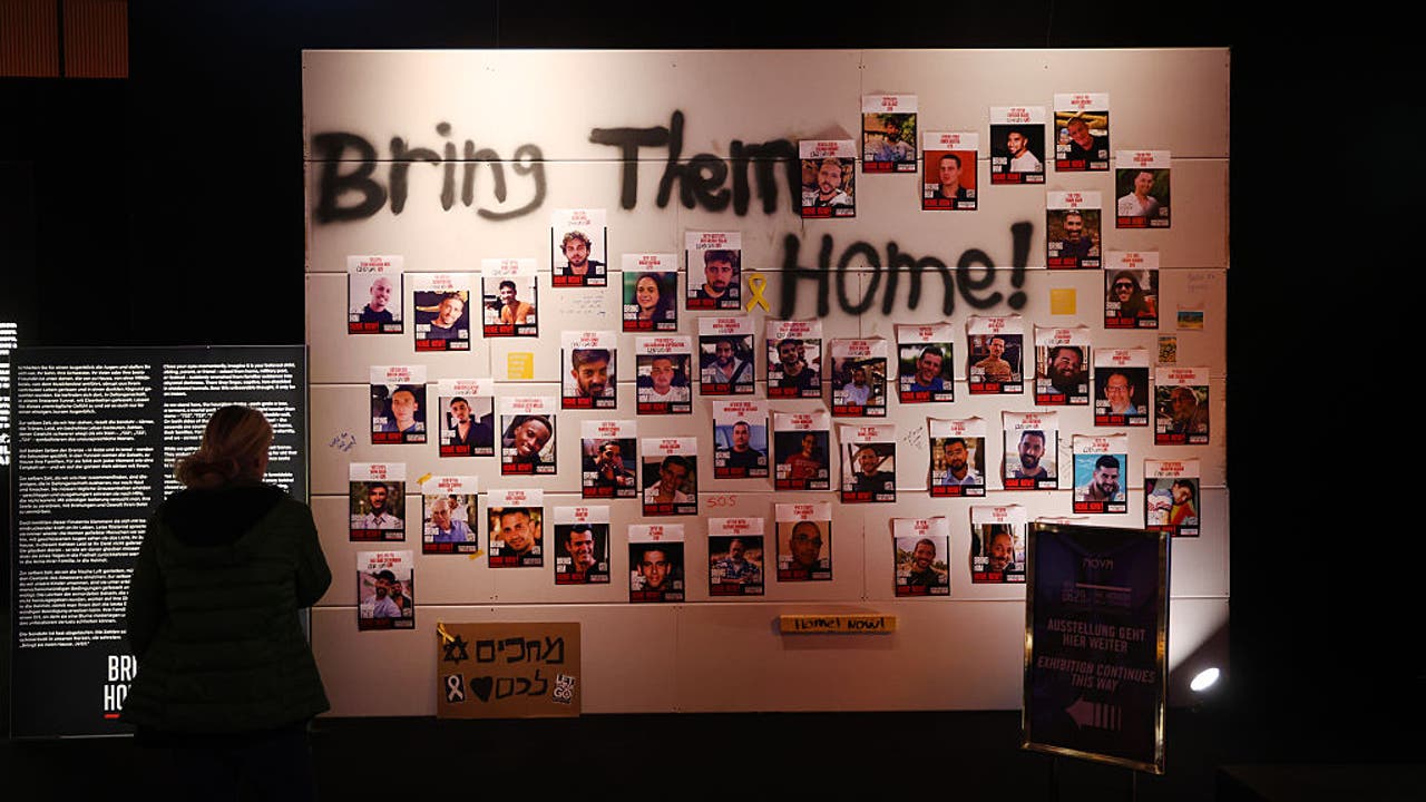 A visitor looks at portraits of hostages taken by Hamas during the Supernova Sukkot Gathering, also called the Nova Music Festival, at the Nova Music Festival Exhibition on the second anniversary of the Hamas attack on October 07, 2025 in Berlin, Ge