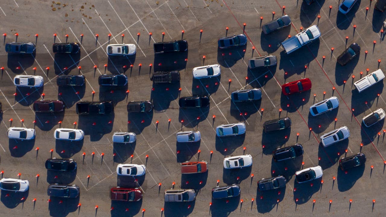 In an aerial view from a drone, cars line up at Dodger Stadium for COVID-19 testing on November 14, 2020 in Los Angeles, California.