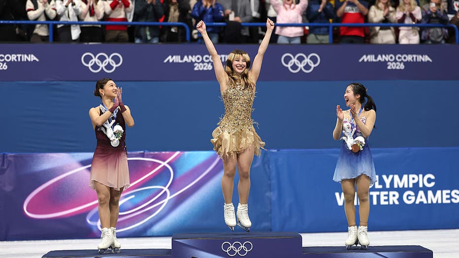 MILAN, ITALY - FEBRUARY 19: Gold medalist Alysa Liu of Team United States celebrates on the podium during the medal ceremony for the Women's Single Skating on day thirteen of the Milano Cortina 2026 Winter Olympic games at Milano Ice Skating Arena on