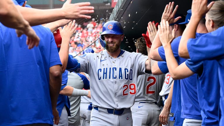 ST LOUIS, MISSOURI - AUGUST 9: Michael Busch #29 of the Chicago Cubs is congratulated by teammates after hitting a three-run home run against the St. Louis Cardinals during the second inning at Busch Stadium on August 9, 2025 in St Louis, Missouri. ( (Jeff Le/Getty Images)