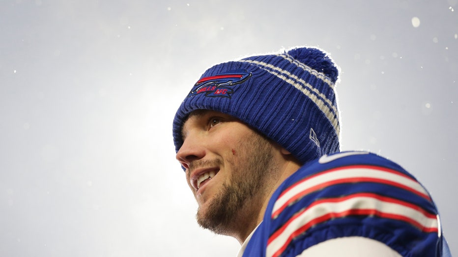 Josh Allen #17 of the Buffalo Bills is interviewed after an NFL football game against the New York Jets at Highmark Stadium on December 11, 2022 in Orchard Park, New York. (Photo by Joshua Bessex/Getty Images)