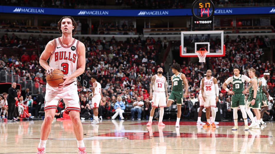 CHICAGO, IL - MARCH 1: Josh Giddey #3 of the Chicago Bulls shoots a free throw during the game against the Milwaukee Bucks on March 1, 2026 at United Center in Chicago, Illinois. NOTE TO USER: User expressly acknowledges and agrees that, by downloadi