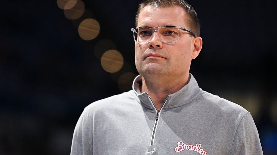TERRE HAUTE, IN - DECEMBER 18: Bradley Braves Head Coach Brian Wardle looks on during the college basketball game between the Bradley Braves and the Indiana State Sycamores on December 18, 2025, at the Hulman Center in Terre Haute, Indiana. (Photo by