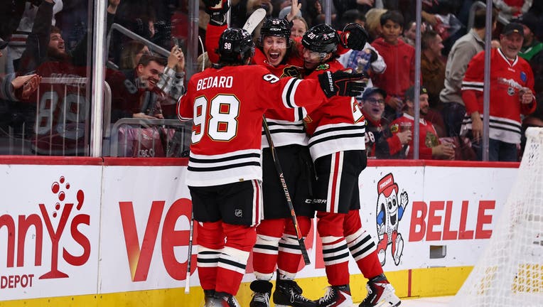 CHICAGO, IL - DECEMBER 10: Tyler Bertuzzi #59 of the Chicago Blackhawks celebrates with teammates after scoring during the third period against the New York Rangers on December 10, 2025 at the United Center in Chicago, Illinois. (Photo by Melissa Tam