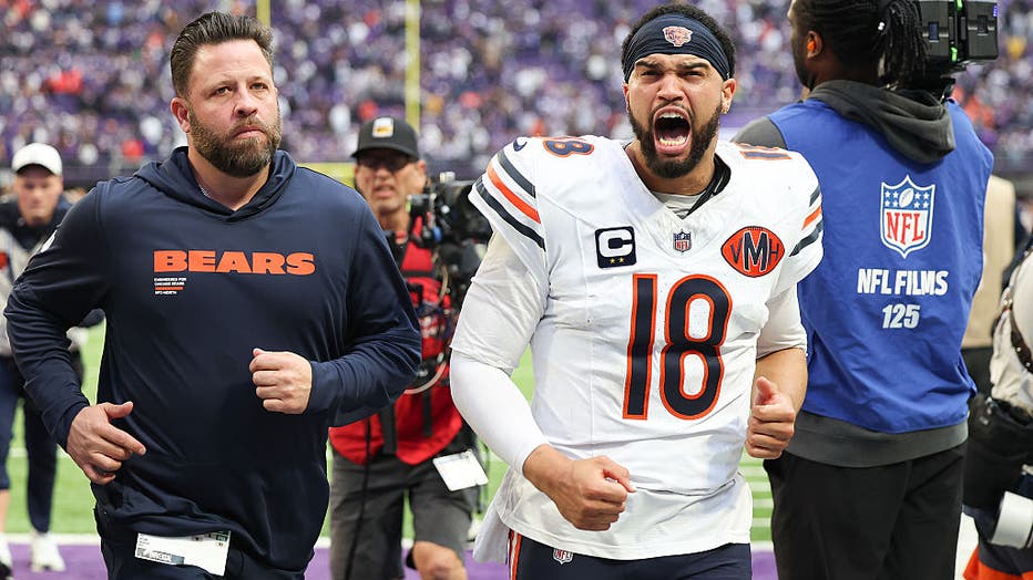 MINNEAPOLIS, MINNESOTA - NOVEMBER 16: Caleb Williams #18 of the Chicago Bears leaves the field after the Bears beat the Minnesota Vikings 19-17 on a field goal as time expired at U.S. Bank Stadium on November 16, 2025 in Minneapolis, Minnesota. (Phot