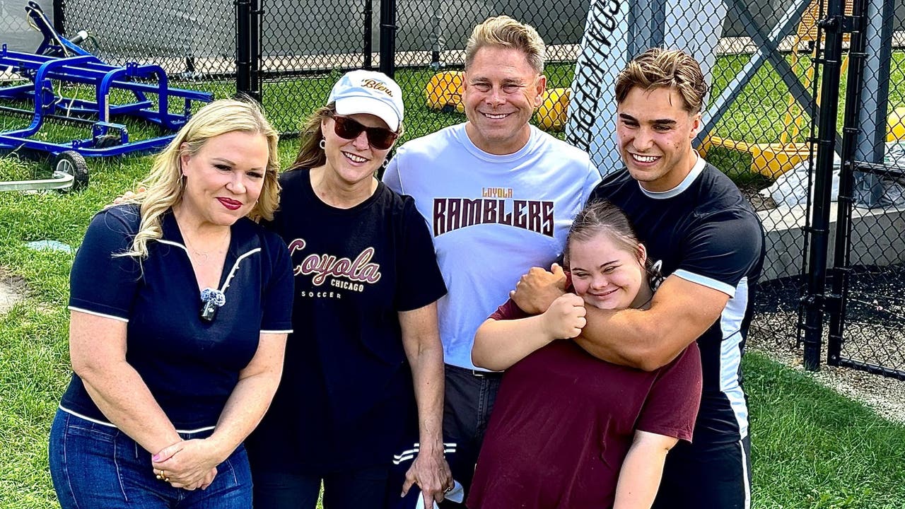 ESPN's Holly Rowe, far left, poses with the Crawford family after Aidan Crawford, far right, after Crawford was named captain of Inaugural Allstate NACDA Good Works Team on August 26, 2025, in Chicago, Ill. (Photo by Chris Kwiecinski)