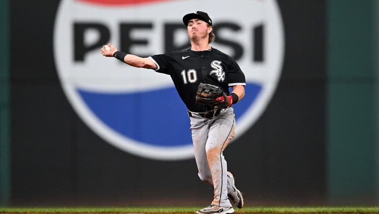 CLEVELAND, OHIO - SEPTEMBER 13: Chase Meidroth #10 of the Chicago White Sox throws out Brayan Rocchio of the Cleveland Guardians at first base during the seventh inning at Progressive Field on September 13, 2025 in Cleveland, Ohio. (Photo by Nick Cam
