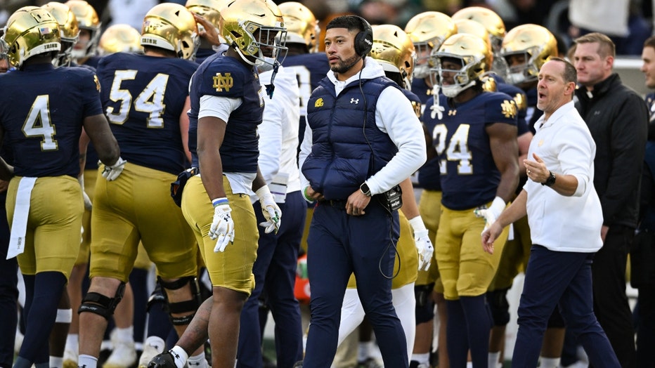 Notre Dame Fighting Irish head coach Marcus Freeman during a college football game between the Syracuse Orange and Notre Dame Fighting Irish on November 22, 2025 at Notre Dame Stadium in South Bend, IN. (James Black/Icon Sportswire via Getty Images / Getty Images)