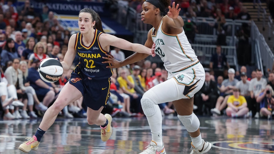 Caitlin Clark #22 of the Indiana Fever dribbles against Kennedy Burke #22 of the New York Liberty at Gainbridge Fieldhouse on June 14, 2025 in Indianapolis, Indiana. ((Photo by M. Anthony Nesmith/Icon Sportswire via Getty Images) / Getty Images)