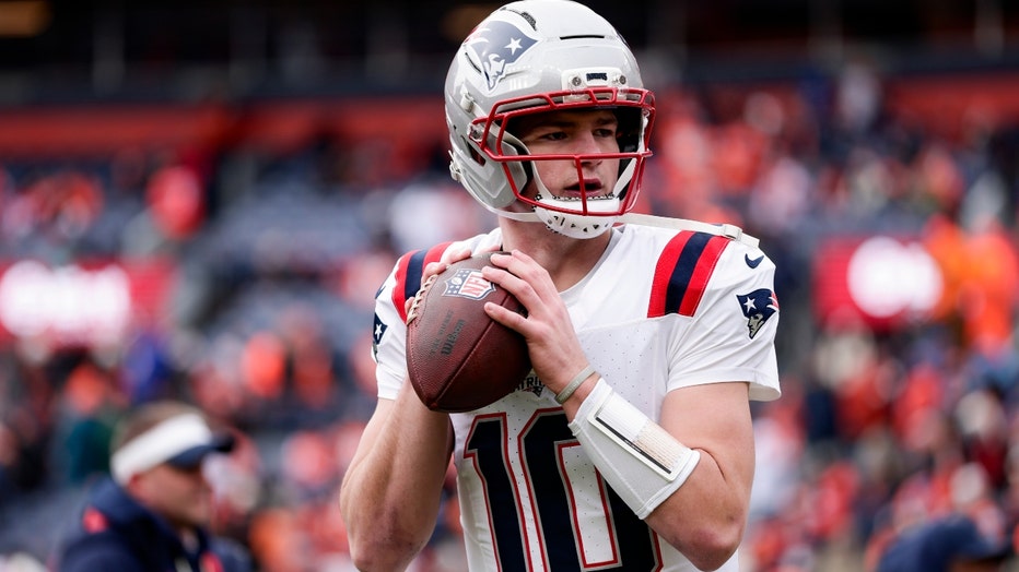 Drake Maye of the New England Patriots warms up prior to the AFC Championship NFL football game against the Denver Broncos at Empower Field At Mile High on January 25, 2026 in Denver, Colorado. (Kara Durrette/Getty Images / Getty Images)