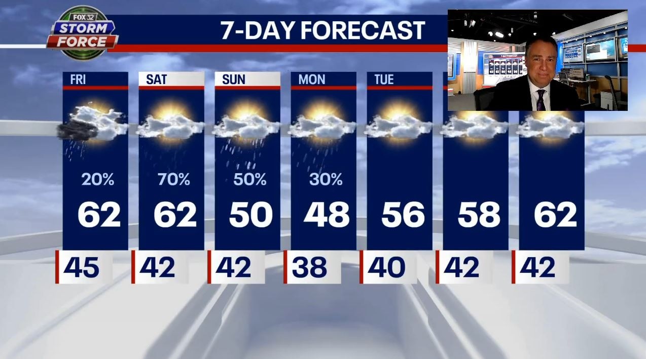 Fox 32's Mike Caplan has your weekend weather outlook. Prepare for cooler temperatures and scattered showers through Monday.