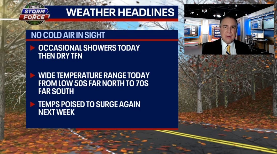 Across the Chicago area today there will be a wide range in temperatures. Those in the northern portion can expect to see highs in the 50s and south of the city highs could reach 70 degrees. Scattered showers are possible all throughout.