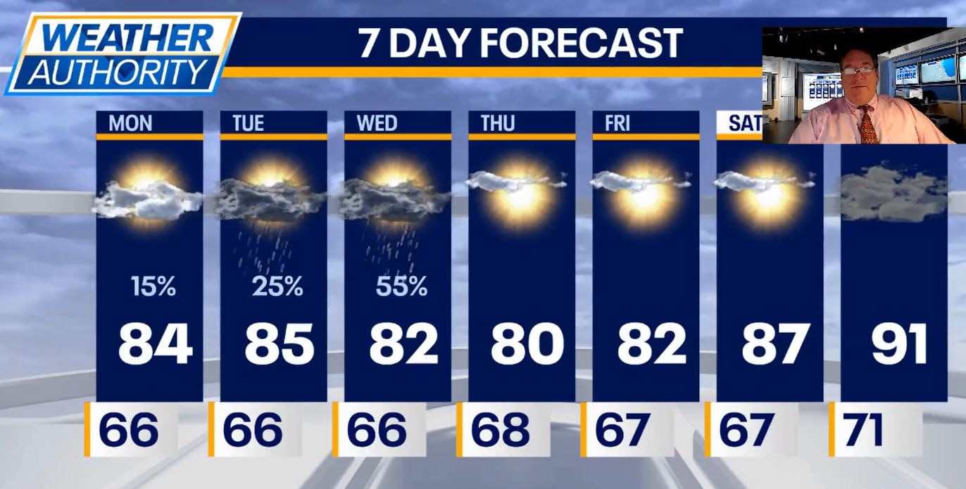 The weekend ends with partly sunny skies and highs in the low 80s. A similar forecast is in store for Monday.