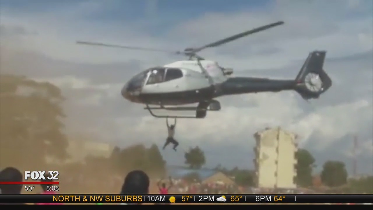 Man dangles from the bottom of a helicopter