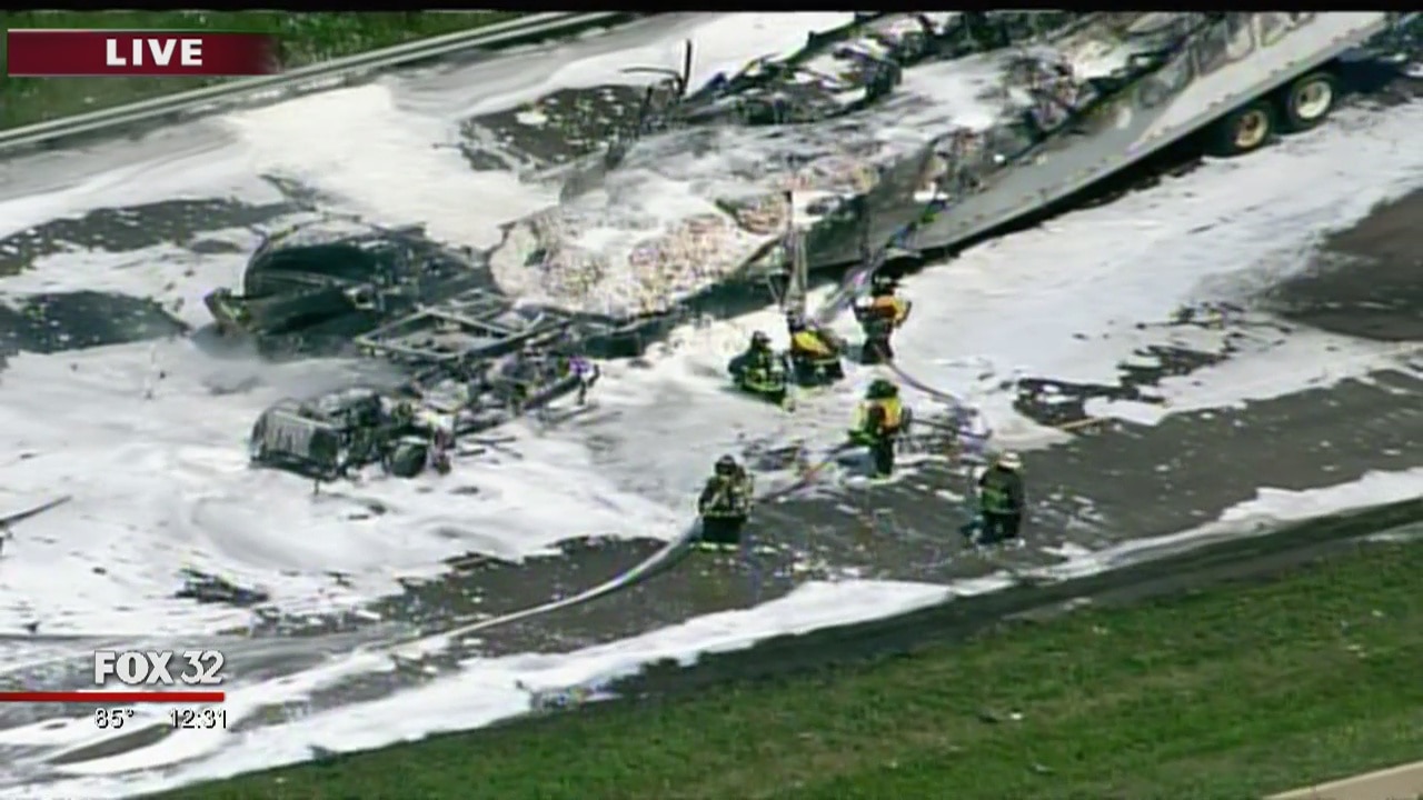 All lanes of the Stevenson Expressway have been shut down after two trucks erupted into flames Monday morning.