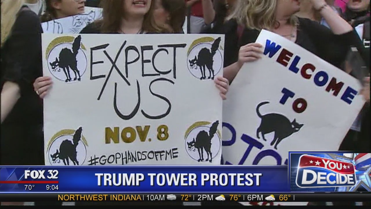 People gathered outside Trump Tower Tuesday morning to protest "the blatant misogyny displayed by Trump, Pence and many others during this election season."